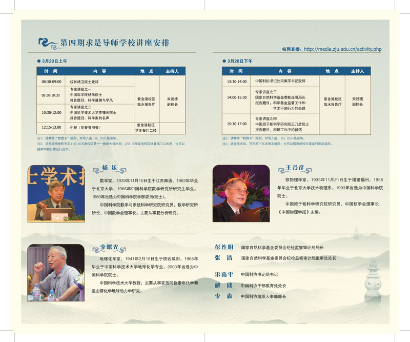 求是导师学校第四期将于3月20日开班。此次导师学校主题是学术道德建设,邀请中国科协、国家自然科学基金委领导专家来校讲座。校网中心将对专家讲座进行网络直播,//media.luoliaoapp.net/activity.php。现将有关事项通知如下: