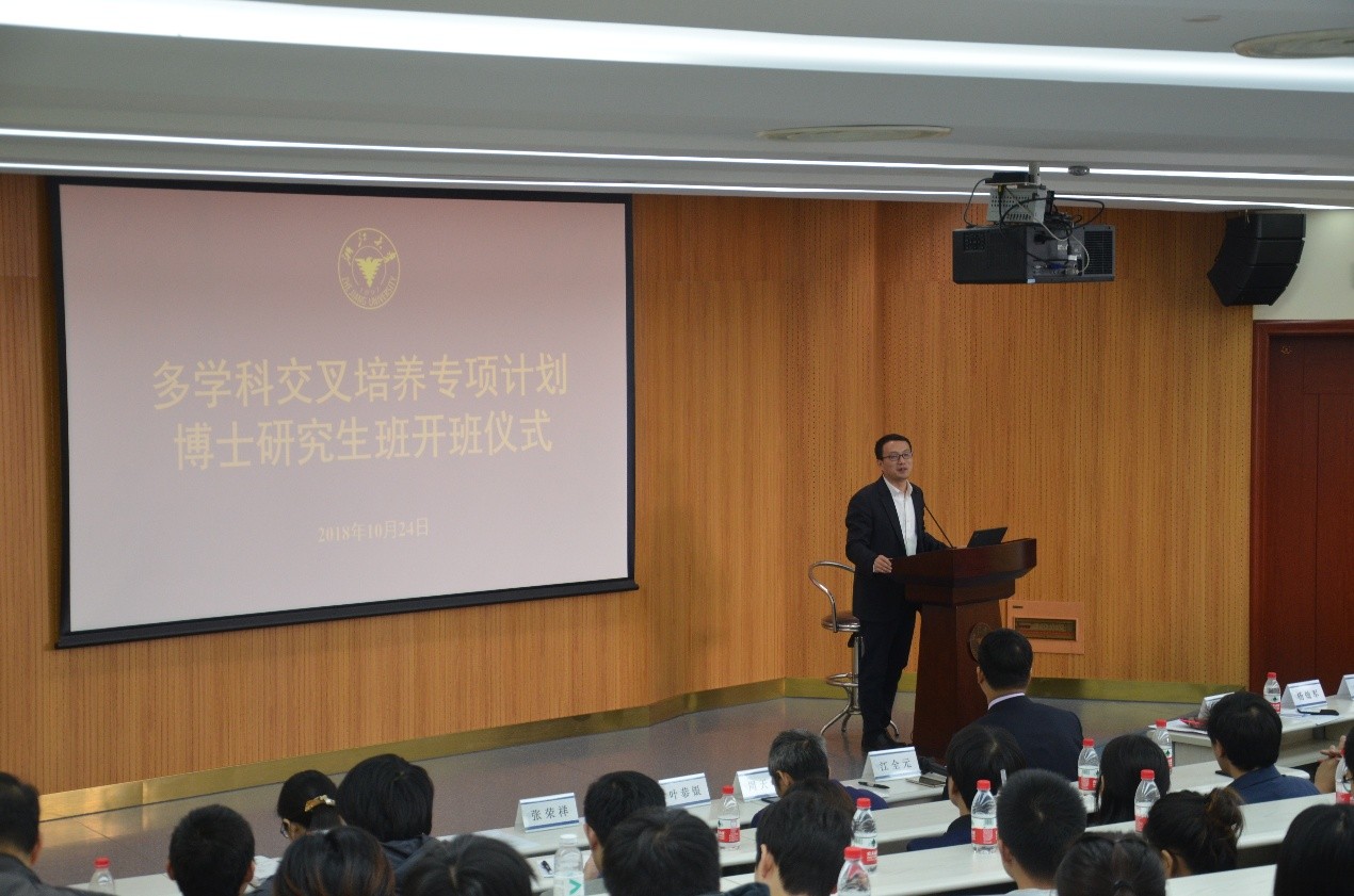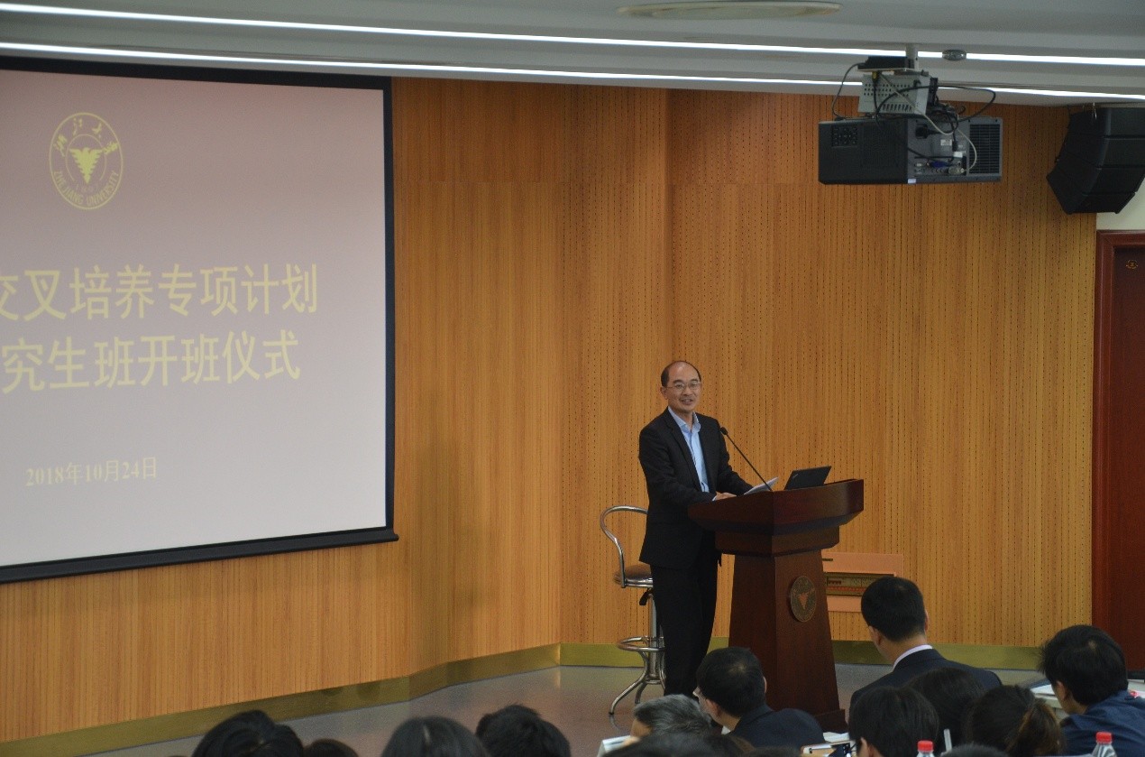 导师代表杨灿军教授作了“不忘初心,持续交叉提升”讲话,从竺可桢老校长的两个问题开始,以解析几何、噬菌体、苹果公司的发展为案例,结合自身的学习经历,阐释多学科交叉背后“宽厚基础知识传授、卓越能力培养、全面素质提高和健全人格养成”四位一体的(KAQ2.0)教育体系,与同学们共勉:只要不忘初心,持续交叉提升,撸起袖子加油干,就一定能创造出前所未有的学术奇迹。