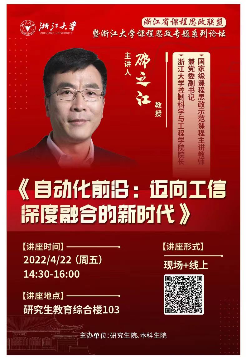 主讲人: 浙江大学控制科学与工程学院院长兼党委副书记 、国家级课程思政示范课程主讲教师 邵之江教授