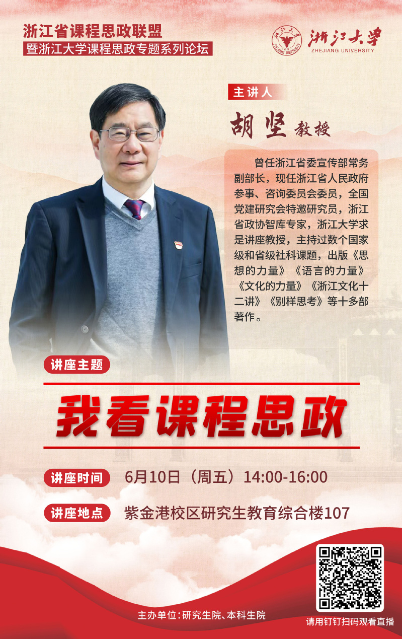 为落实立德树人根本任务,全面推动我校课程思政建设,发挥所有课程育人功能,营造课程思政育人氛围,根据2022年上半年“浙江大学课程思政工作坊”工作方案,特邀请胡坚教授主讲课程思政专题论坛。