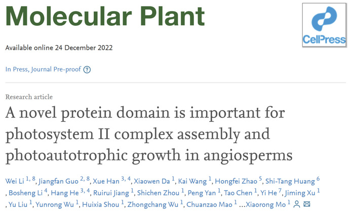 The research article of Prof. Mo Xiaorong’s laboratory title “A novel protein domain is important for photosystem II complex assembly and photoautotrophic growth in angiosperms” has been published on Molecular Plant on December 23, 2022.
