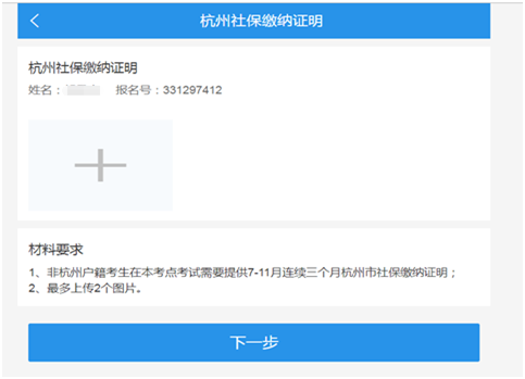 八、考生根据自己报考身份的实际情况,有选择性上传《杭州社保缴纳证明》、《学籍(学历)在线验证报告或改姓名公安局证明或改身份证号码公安局证明》等材料完成后点击“下一步”、“确认并提交”
