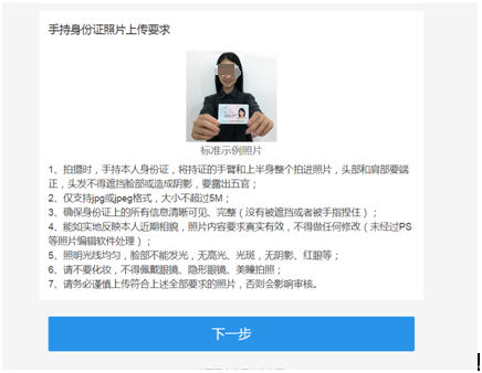 七、上传手持身份证照片后,点击“下一步”。