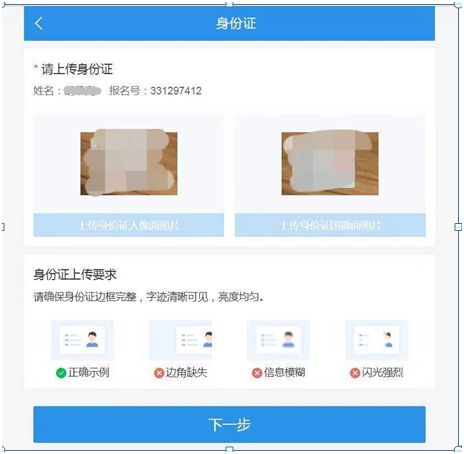 六、上传身份证照片后,点击下一步。