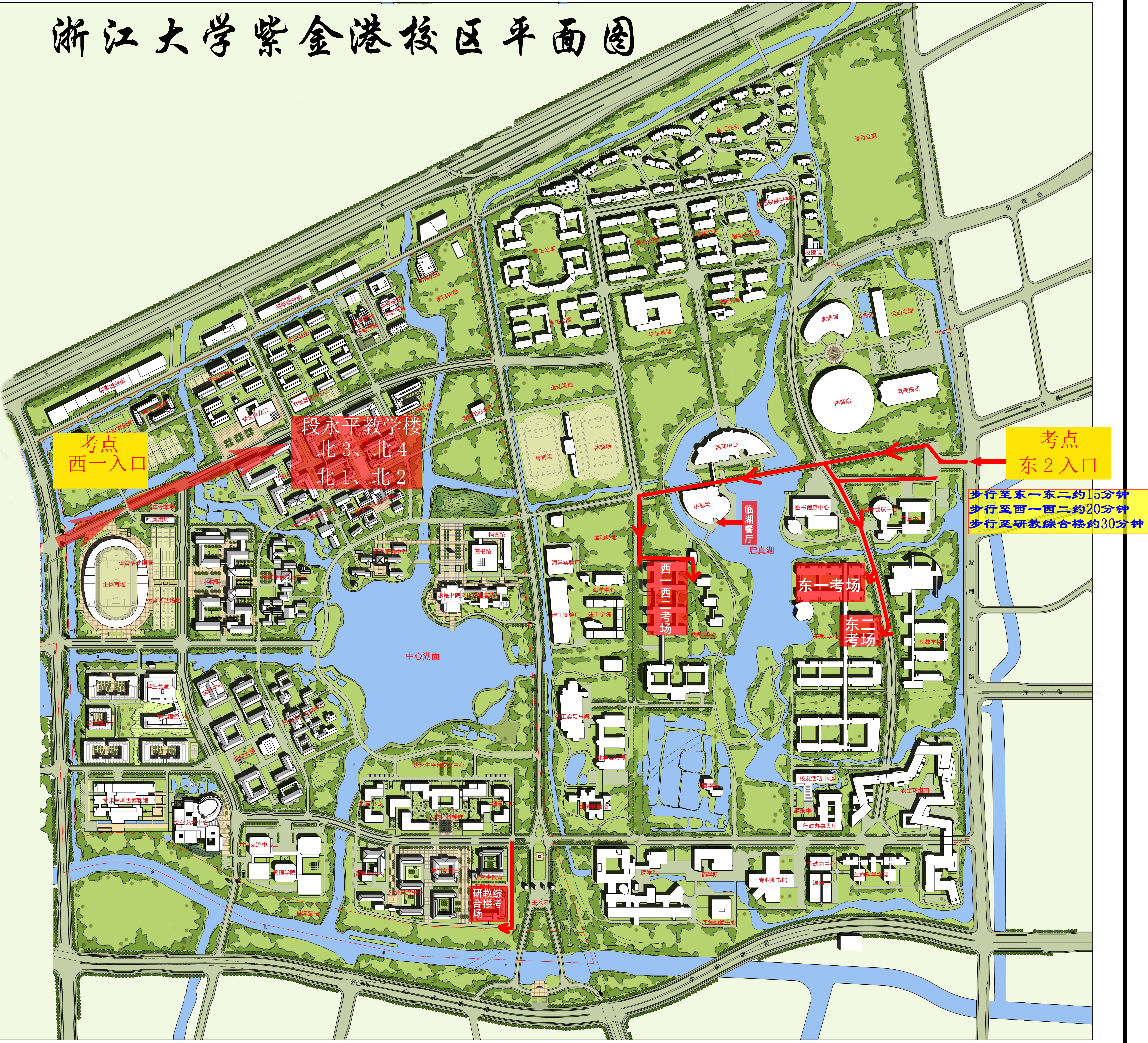 考试地点为东一、东二、西一、西二教学楼的考生:唯一入校和出校通道设置在东2门(申花路)。从东2门步行至东一、东二教学楼约需15分钟,至西一、西二教学楼约需25分钟。
